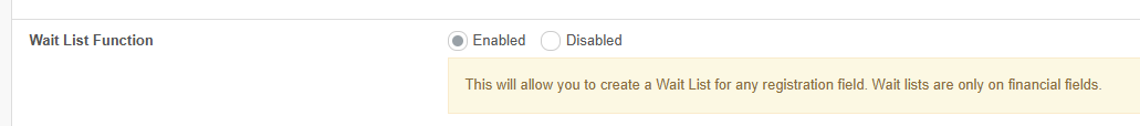 - Wait List Activated will automatically be set to no. When your field's max count is hit it will automatically be turned on (set to Yes). This is an admin override to turn it on before or turn it off manually.