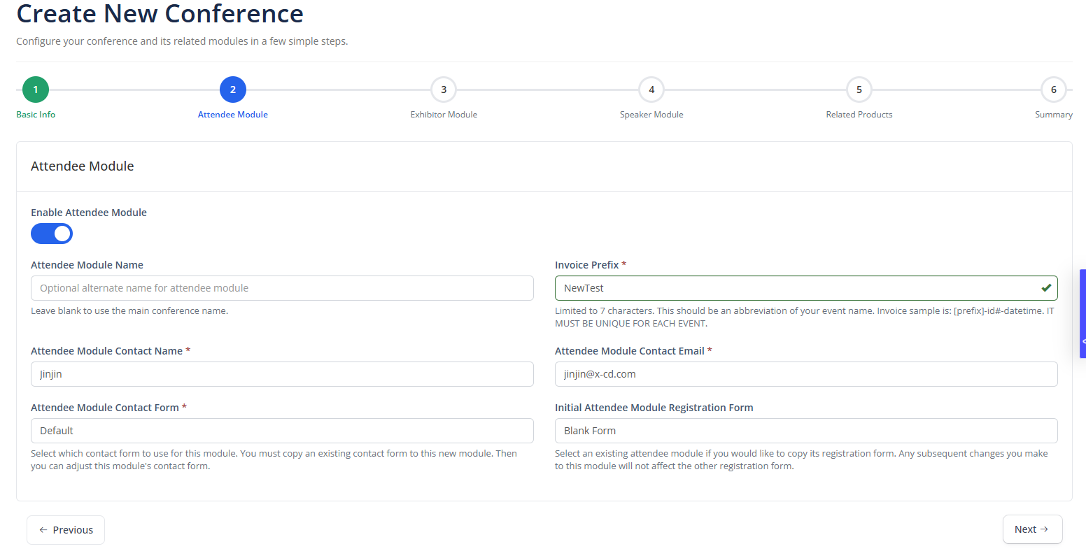 - You can then activate the modules you wish to use for the conference, and customize each of them to your liking. You are able to activate the Attendee, Exhibitor and Submission modules.