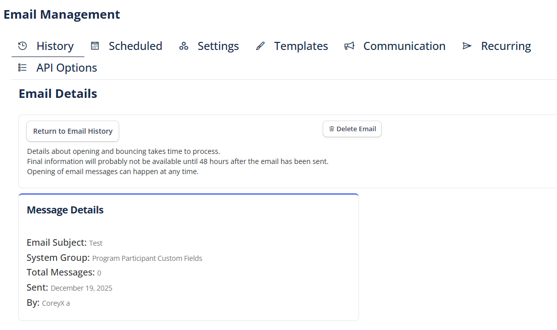 Email History will allow you to view statistics of emails that and admin has sent or scheduled to send and/or view the email content. Click Dashboard Click Email Management in left-side menu Click History tab > this will display emails sent out ...