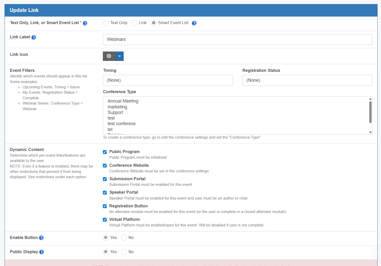 4. Adjust the feature/links accordingly. This determines what links are available on a per-event basis. See the descriptions under each feature to learn more about additional restrictions.