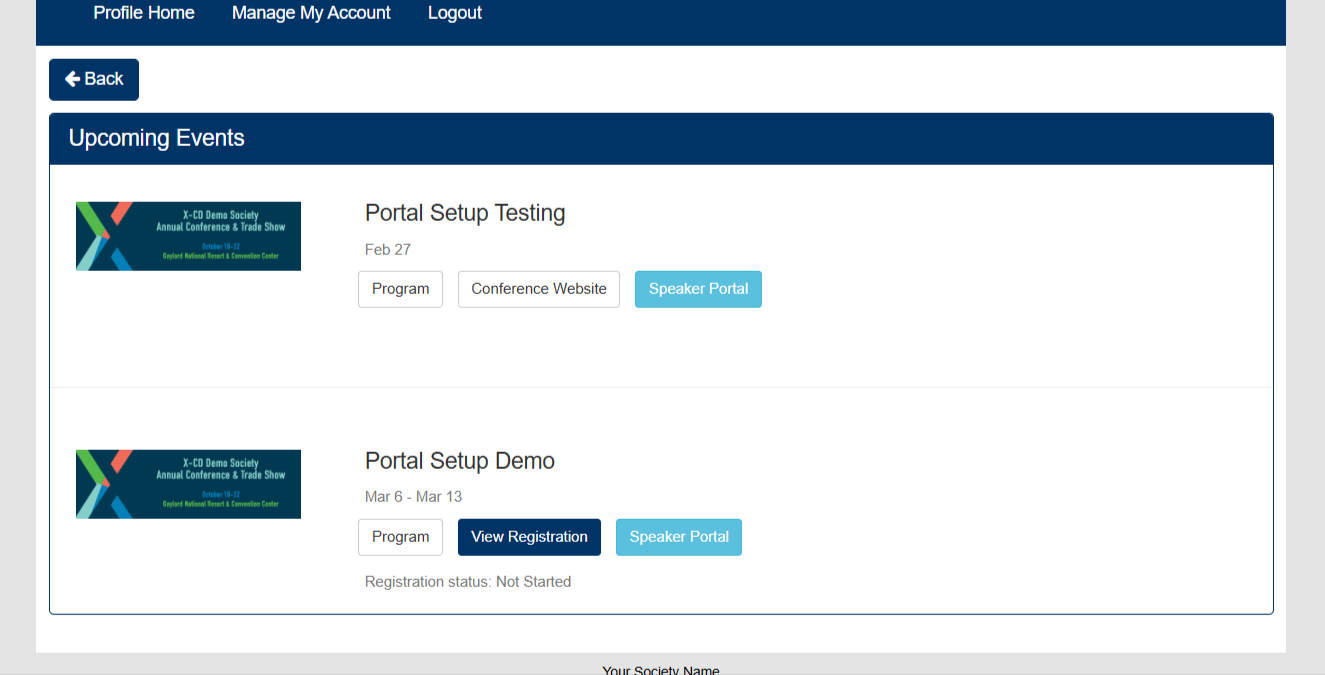 Smart Event Lists are screens linked from the profile home page, which can show a set of events based on the type, timing, or the user's registration status. For each event, various links/features can be added. Registration links, the conference website or public program, even the speaker portal or virtual platform can automatically be added accordingly.