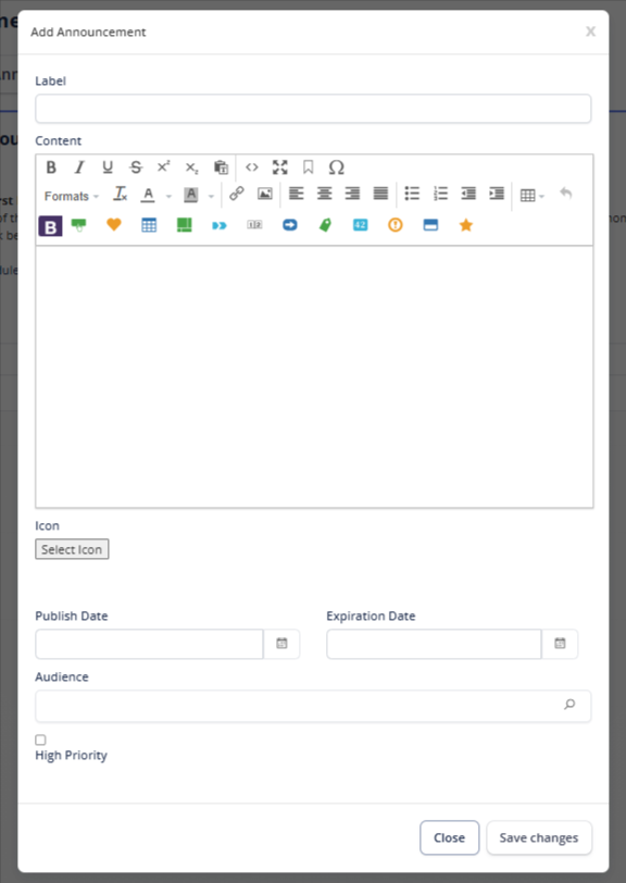- High Priority (optional): Will pin this announcement to the top of the list. Note, in smaller views, only 3 announcements will appear. Adding more than three high priority announcements may not be very helpful.