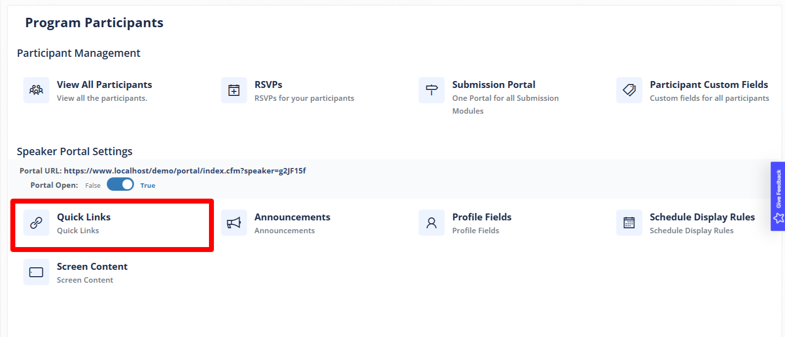 To setup your quick links click on Quick Links under Speaker Portal Settings: