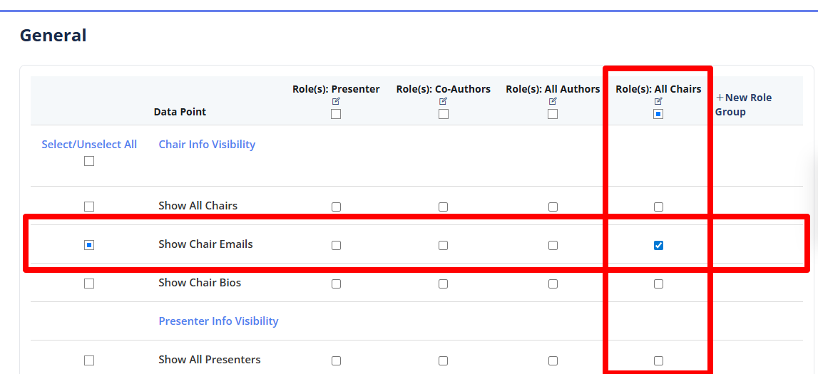 For example (see image below), in the General grid—which controls high-level visibility rules for session information—you will see a checkmark in the Show Chair Emails row under the All Chairs column. This indicates that all users with a chair role are permitted to view chair email addresses in the portal.