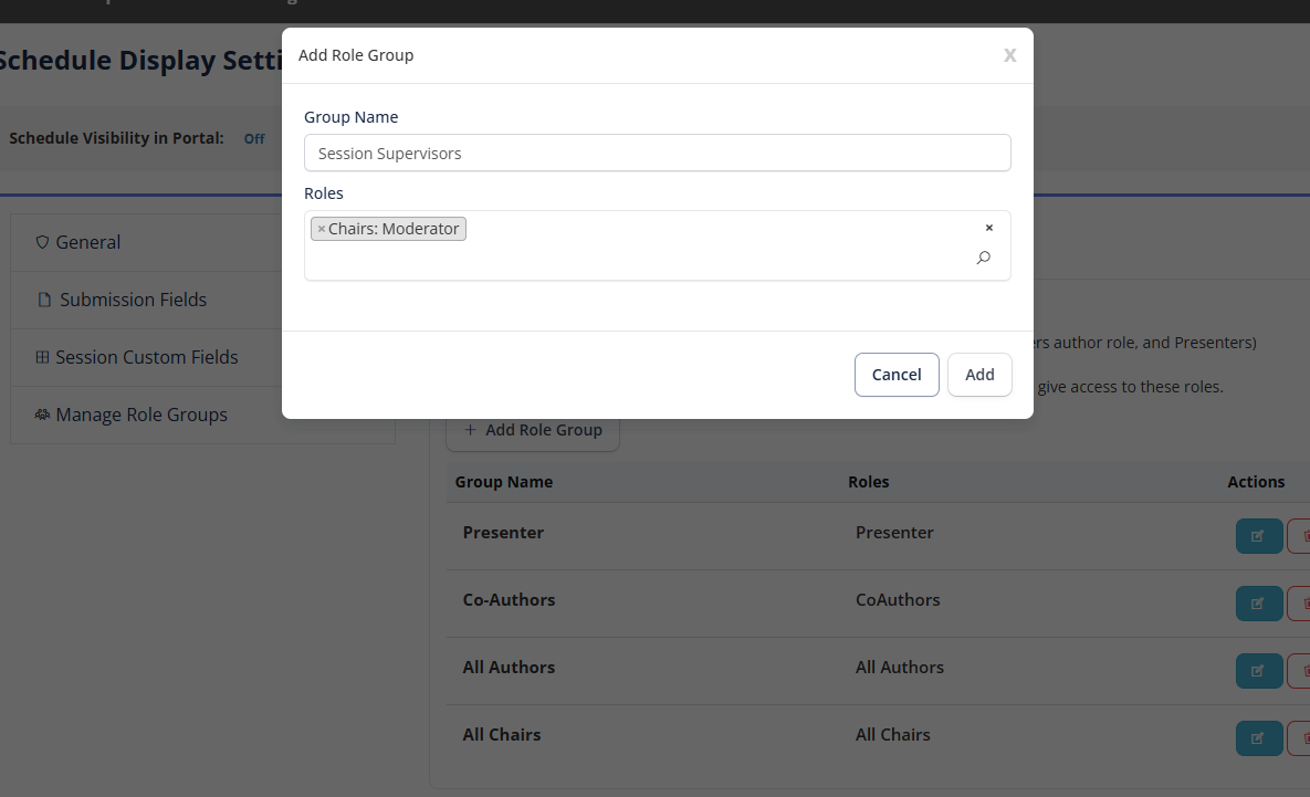 For example, if you want to define visibility rules specifically for Session Supervisors (a subset of chairs), you can either modify an existing role group or click New Role Group. You can then rename the group and select the roles it should apply to.